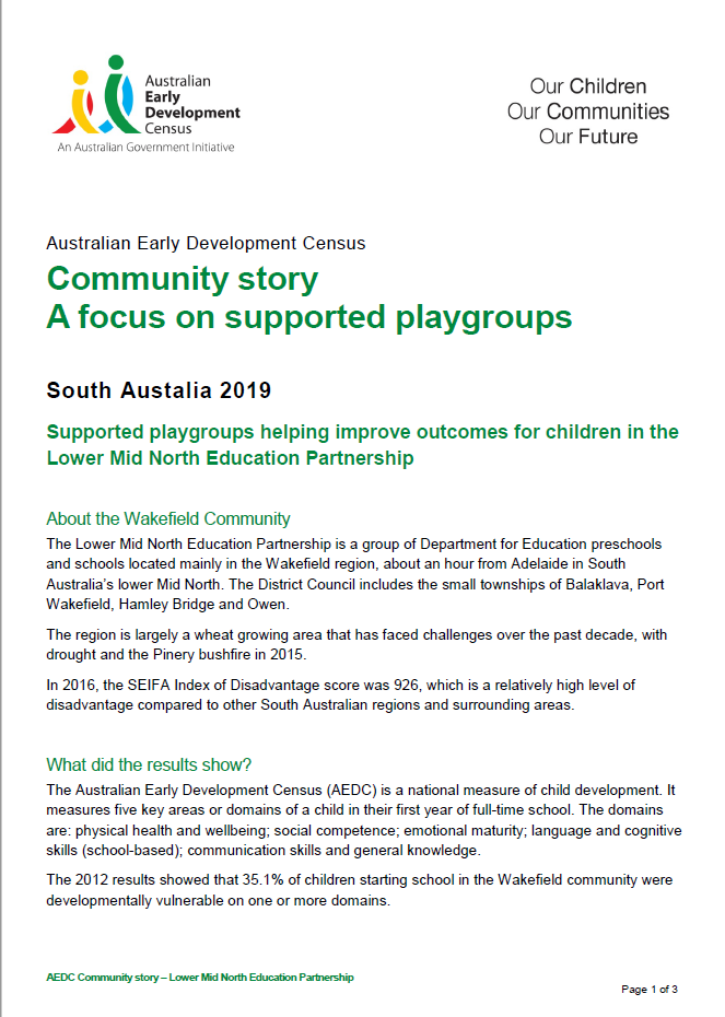 The 2015 AEDC results showed that the trend of higher than average developmental vulnerability had worsened across the Wakefield community. This prompted the Lower Mid North Education Partnership cluster of government preschools and schools to join together on a new multi-faceted project that began in 2017.