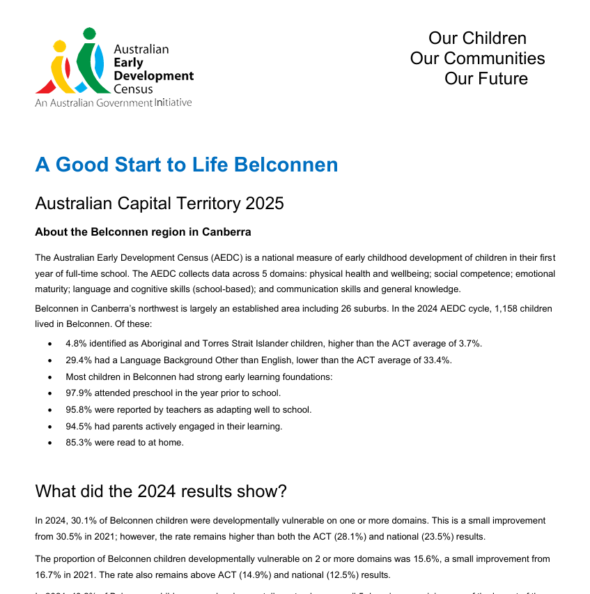 The AEDC played a pivotal role in the ‘Good Start in Life for Young Children’ research project (2019-2023) at the Health Research Institute, University of Canberra. Using AEDC data and trends from 2015 to 2018, the project identified 9 suburbs in the Belconnen District where early childhood development risk was highest.
